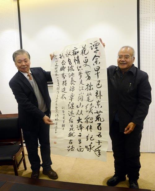 张福有向刘自力赠送诗作并书法。李景喜 摄