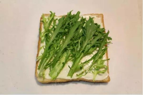 2.取一片吐司上面均匀的涂抹上美乃滋酱,然后在上面均匀的铺一层苦菊菜,不用铺的太厚但是要分布的均匀