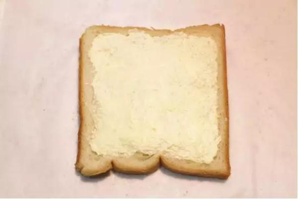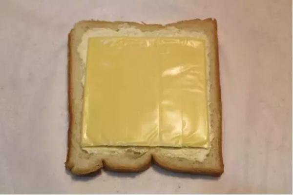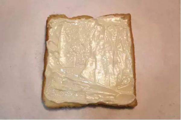 3.在上面放第二层吐司,然后把软化的乳酪涂抹在上面,抹好后在上面放上芝士片