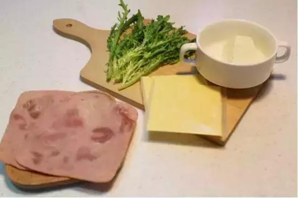 材料:原味白吐司(或全麦吐司)3片、火腿2片、苦菊1小把、乳酪20g、芝士(片状)1片、美乃滋酱20g