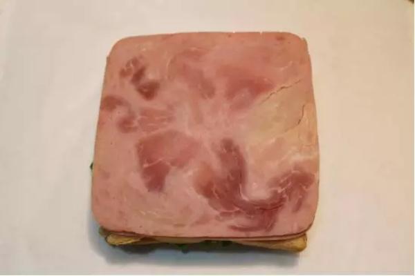 4.在芝士片上放两片火腿,然后盖上最后一层吐司,入烤箱中层170度烤3分钟(这一步选择不烘烤也可以,也很美味,如果烘烤请在第2步就开始预热烤箱)