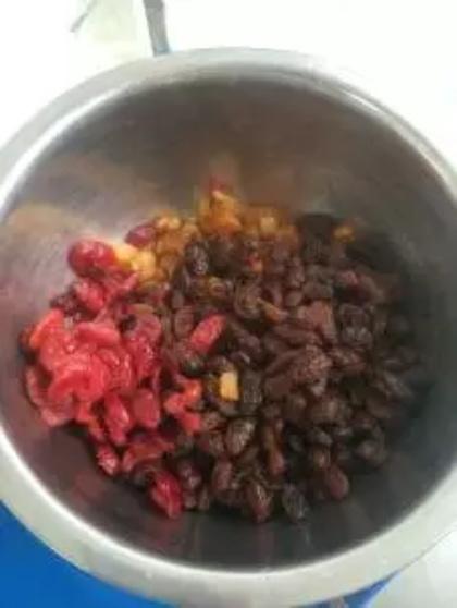 3.乘这个机会准备杏仁膏、腌制橙皮丁和提子干,把杏仁粉、白和糖粉拌匀,放置一会就成了杏仁膏,把橙皮丁和提子干、蔓越莓干以及朗姆酒混合均匀,进行腌制。