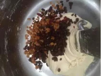 5.搅拌到面筋形成,加入奶油,先慢速,再快速,等油脂完全被吸收,加入腌制好的果料,慢速拌匀。