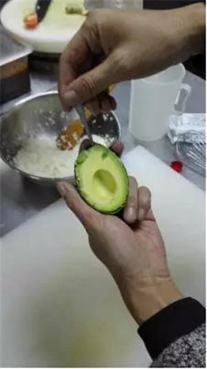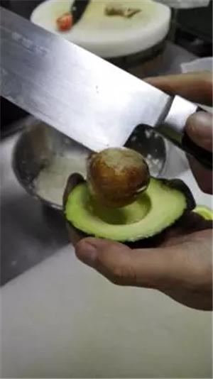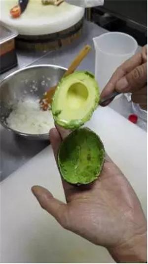 2、牛油果对半切开挖去果核,并用勺子挖出果肉(尽量保证果肉的完整),挖出后切薄片儿备用;