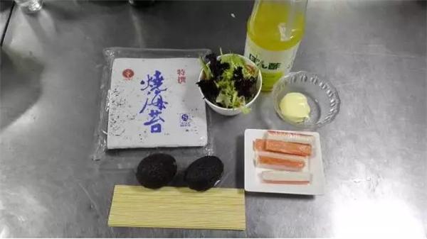 食材:牛油果、生菜、蟹棒、黄瓜、鸡蛋、海苔片