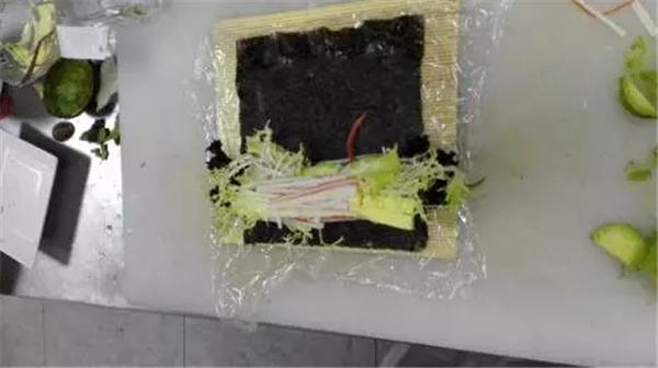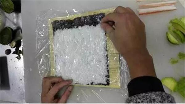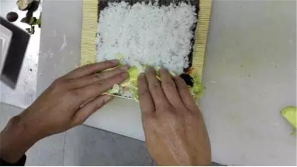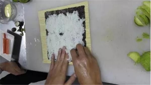 除了上述的反卷寿司的卷法之外,海苔在外米饭在内的卷法也可以完成适用,即可以将牛油果切丝、切片卷入其中,方法更为简单,如下图: