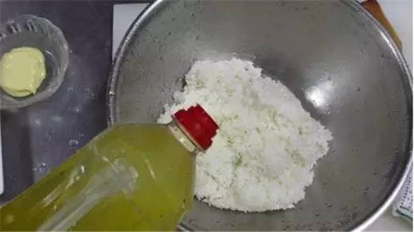 4、在温热的米饭中,加入调好的寿司醋搅匀至米饭带有粘度;