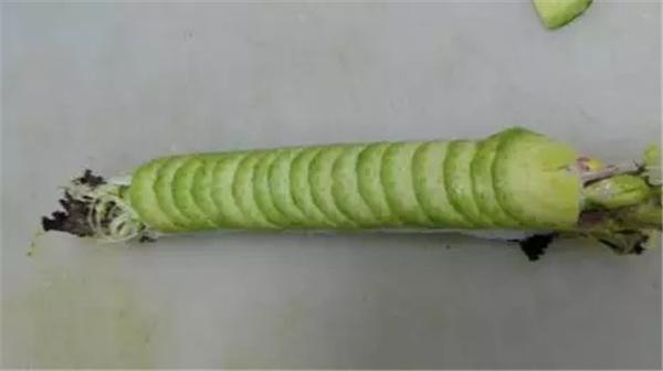 7、寿司卷实后,将牛油果片叠盖在寿司卷上,牛油果寿司就做好了,最后,我们将它分段切开,搭配上由绿芥末和日本酱油调制的蘸料,一份牛油果寿司即可享用。