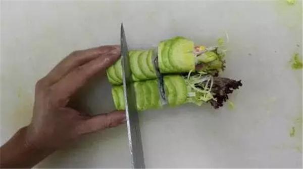 或者你还可以将蔬菜、牛油果等直接卷入海苔片中,也可以,在海苔卷封口处微微沾上一些水即可将蔬菜卷裹得紧实,如下图: