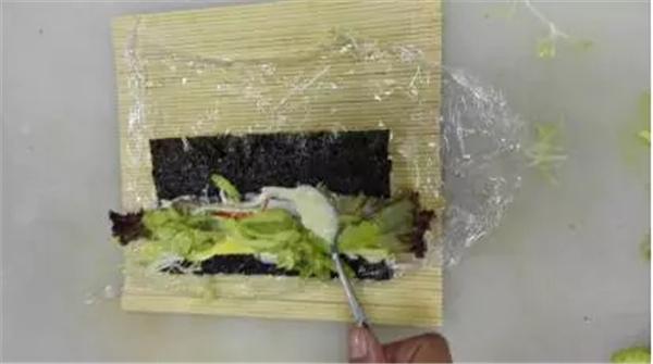 6、将保鲜膜覆盖在米饭上面,翻面过来变保鲜膜为底平铺在竹帘上,将准备好的蔬菜丝、蟹棒丝、鸡蛋丝码放在海苔一端,加入一层沙拉酱,用寿司帘卷实,边卷边揭开保鲜膜(千万不要将保鲜膜卷进寿司哦);