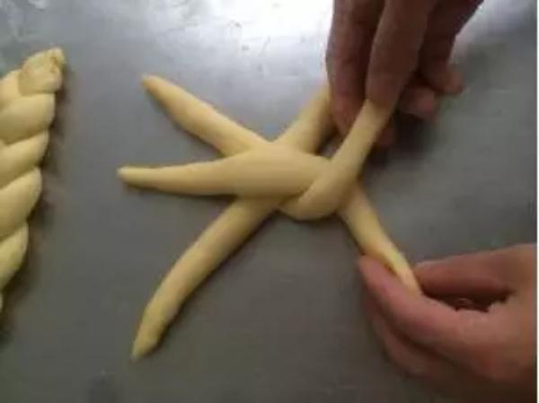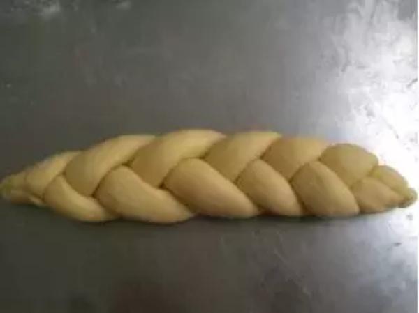 7.把长条的面团搓成中间粗,两头细的更长的长条,约25公分,三条一组,编成辫子,两团接头捏死