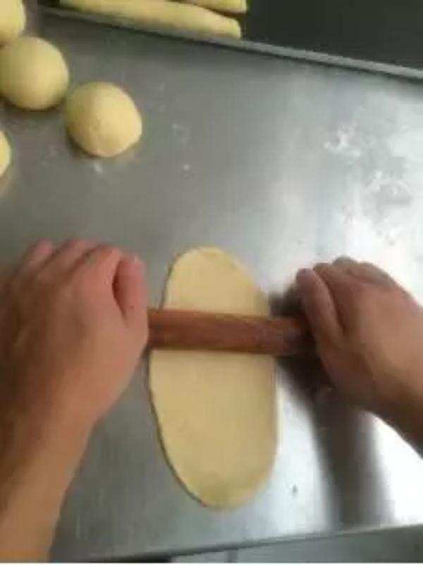 6.把面团擀开,翻面,卷成约15公分,松弛10分钟