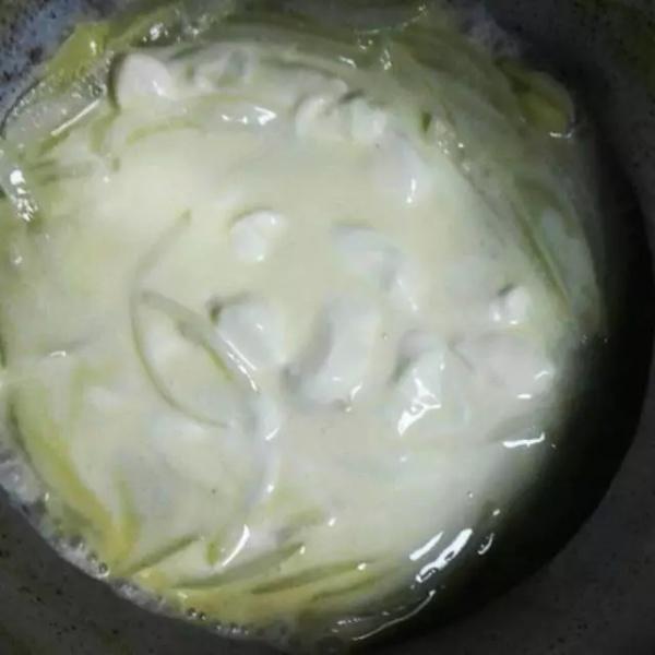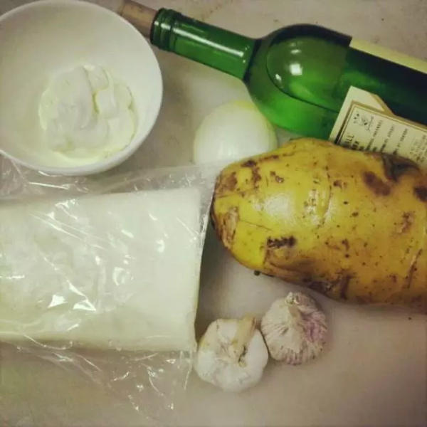 2、把切好的洋葱和蒜用放入少量白葡萄酒中煸煮,直到酒精完全挥发。然后调入淡奶油煮一分钟,再加入奶油芝士煮到完全融化后,调入盐和白胡椒做成酱汁。
