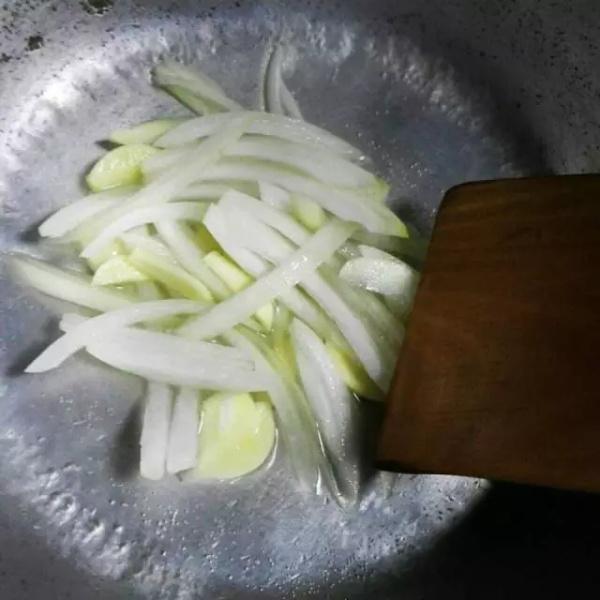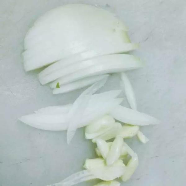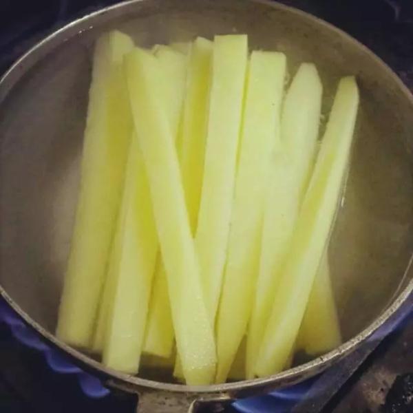 1、将洋葱切丝、蒜切片备用;将土豆切成粗条。切成粗条的土豆放在水中煮4分钟。