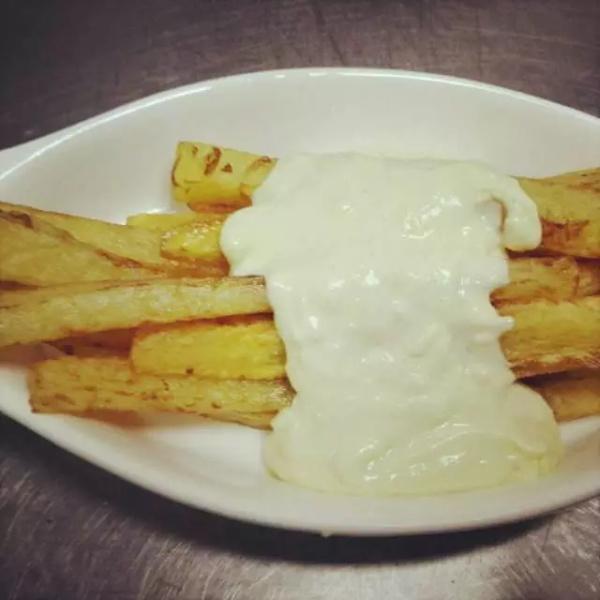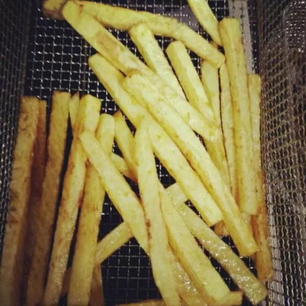 3、煮好的薯条首先要沥干水分;然后放入160度的油中炸4分钟;待油温升到190°炸1分钟,取出沥干油分装盘。再浇上制作好的酱汁就好了。