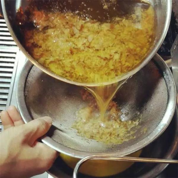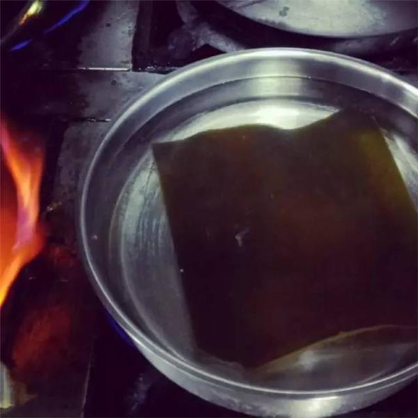 5、将水烧开,放入柴鱼片及部分海带煮水熬制汤底后,用滤网将柴鱼片和海带滤出保留汤底。