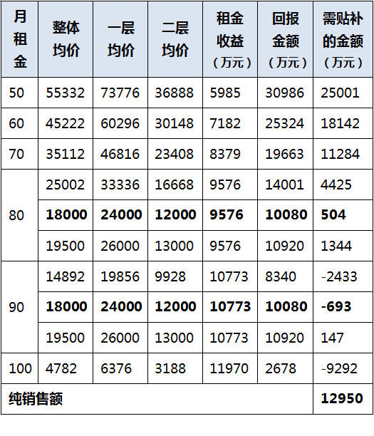 当租金达到80元/㎡,商场整体销售均价在18000元/㎡时,发展商需贴补的金额最少,如果均价超过这个价格,则需贴补的金额也要相应增加;