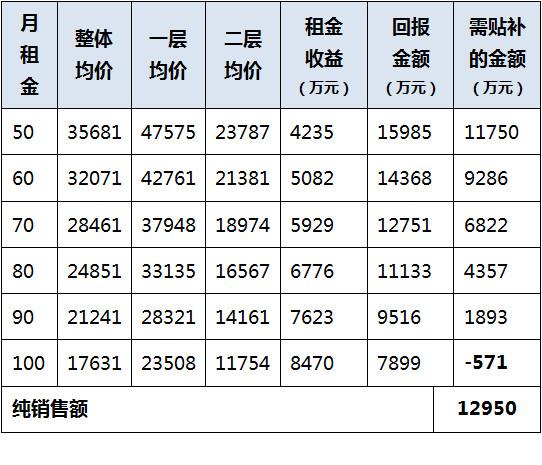 按照月租金从50元/㎡到100元/㎡的价格,带入到公式中,则得到相应的销售均价,既当该好百年的租金达到某个价格时,要实现相应的销售整体均价,才能保证发展商能够得到纯销售额。(二层均价按照2:1的比例计算。)