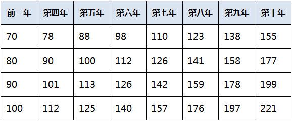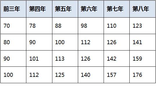 由以上递增方式得出:每年租金表(元/㎡)