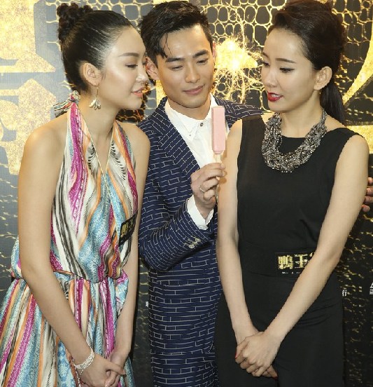 1月13日报道 何浩文、文凯玲等在香港为电影《鸭王2》宣传造势,女演员们两人同舔一根冰棍。CFP