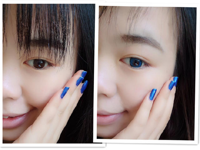 这是对比图,裸眼和带了海蓝色美瞳的眼睛,瞳孔放大,感觉还有点点亮肤色的作用。可丽博clearcolor燃彩彩色隐形眼镜依据东方人的角膜以及瞳孔的大小等特质研发而成。