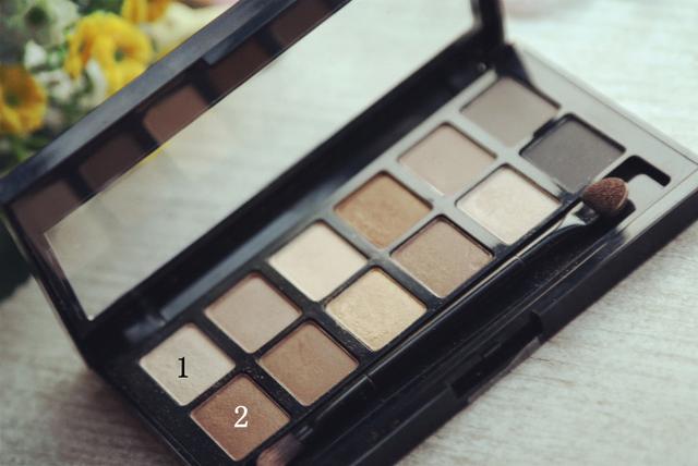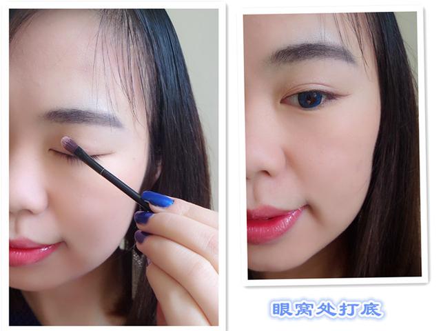 2号色在眼窝处打底,因为只比肤色深一点,所以要来回多刷几次才显色~