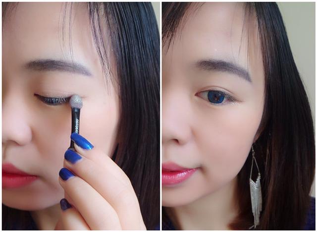 因为海蓝色本来就毕竟命令了,我想做的又是个简单清澈的妆容,所以眼线液不能画得太浓重,就在内眼线处轻轻勾勒出一条细细的眼线即可~