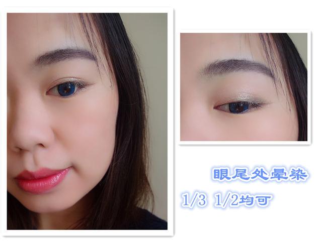 先用3号色从眼尾开始像眼头晕染,晕染到2/3、1/2处均可,看个人喜欢,我一般是1/2处多一点~这款眼影略带了点珠光,让眼镜有点blingbling的感觉!