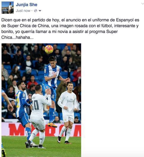 事件:皇马与西班牙人的西甲联赛,西班牙人身穿的球衣植入了超级女声。