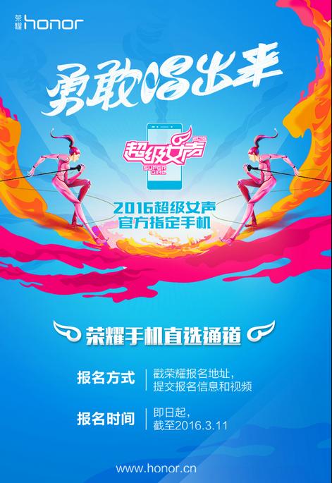 而让人印象深刻的跨界营销相信更是荣耀的初步尝试,与滴滴的合作、功夫熊猫的代言、周年庆的演唱会等等。不难发现,荣耀正在往年轻人的娱乐模式越来越贴合,16年的营销方向相信会更加多的向娱乐营销倾斜。就在今天,荣耀更放出了与超级女声的报名通道。