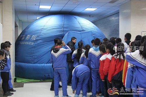 同学排队进入流动球幕影院。