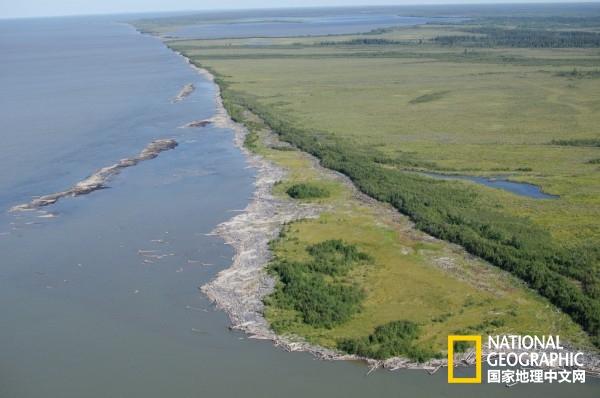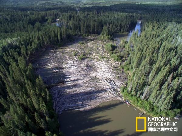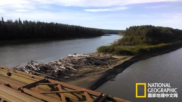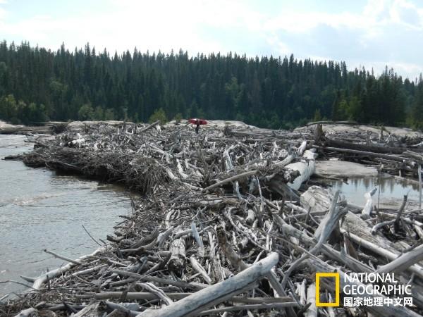 在加拿大西北地区的斯来夫河(Slave River)里,大量漂流木聚集于此,看起来就像一艘与河同宽的超级木筏。同样的场景记录在亚历山大.麦肯齐1789年的日记中,当时他正在探寻通往大西洋的路线。木筏后部竟然已经长出了新生的树木。