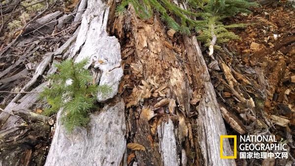在岸边的朽木上,云杉幼苗率先破壳而出。