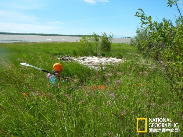 在斯来夫河,各种芦苇属植物和杂草“捕获”了成排的漂流木和随之而来的泥沙。其实漂流木堆积处的下方,腐烂的木头已深陷泥沙之中,有数米之厚。画面中正在忙碌的是Ellen Wohl。