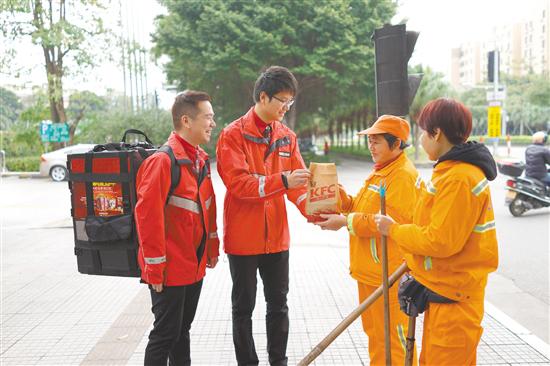 “每到春节等节假日,环卫工人们不仅无法休息,工作量还比往常大了许多。他们在寒冷的户外工作,非常辛苦,希望我们的举动能让他们感受到温暖。”肯德基益华餐厅的员工区锐铭说。随后,他和其他伙伴们背着外送保温箱,到附近街道,把一份份新鲜出炉的爱心早餐一一送到环卫工人手上。