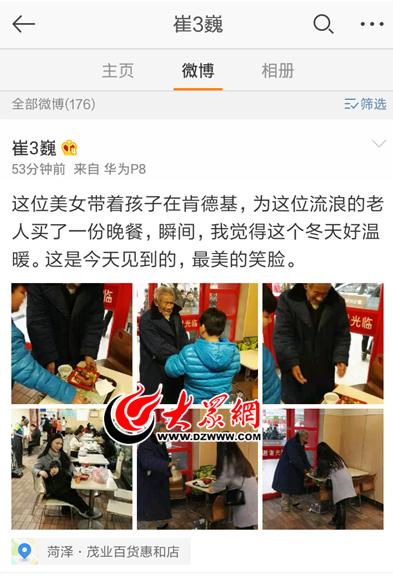 “这位美女带着孩子在肯德基,为这位流浪的老人买了一份晚餐,瞬间,我觉得这个冬天好温暖。这是今天见到的,最美的笑脸。”网友“崔3巍”在微博中这样写道,他告诉大众网记者,今天菏泽最低温度达到了零下14度,但当他看到这个瞬间时,感觉整个世界都温暖了。于是,平时他一直热心公益事业,看到这样的感人瞬间,便随手拍了下来,并通过网络发布出去,“希望这样的正能量能够传递出去!