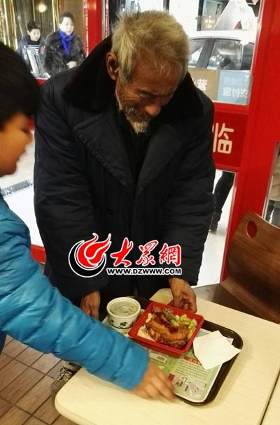 大众网菏泽1月23日讯(记者张鹏)今天,菏泽大众网网友“崔3巍”微博爆料,晚上7点多,他在菏泽银座商场附近的肯德基餐厅,看到有一位女士端了一份肯德基套餐,给流浪汉吃。从照片中,大众网记者看到,该流浪汉穿着破旧的大衣,头发和胡子已经花白,一位女士端着一个托盘送到这个流浪汉的面前,托盘上是一碗汤和一份鸡肉饭。