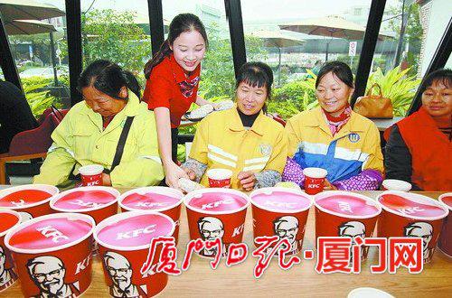 本报讯 (文/图 通讯员 程辉 记者 程午鹏)昨日,寒潮再度来袭,厦门肯德基闽南印象餐厅准备了早餐和御寒物品,为30多名环卫工人送上暖胃、暖身、暖心的礼物。