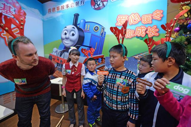 在美籍英语老师Josh的引导下,孩子们充满稚气的嗓音、洋溢着快乐的答案回荡在肯德基黑牛城餐厅。2015年12月22日下午,“相约肯德基爱心暖冬伴你成长”肯德基社区关爱行动在肯德基黑牛城餐厅举行。在肯德基故事姐姐和“伴你成长”公益计划的志愿者引领下,来自河西区尖山街红山里社区外来务工人员的子女边听故事、边游戏、边学单词,共同感受肯德基传达的温馨与美意。