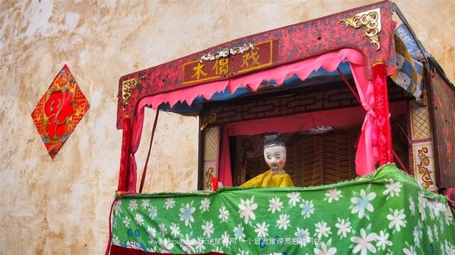 没随着人潮追赶新婚夫妻的脚步,而是走街串巷地细细感受民俗村里带来的齐鲁气息。满街的金色玉米带着收获的喜悦,红色的标语让人瞬间穿越回从前。一个小小的舞台和小小的演员,吸引了大家长久地驻足。第一次看木偶戏,演戏的老翁目测年过七旬,他的眼镜是那种旧时代的圆片眼睛,眼镜腿用白色的胶布紧紧地缠绕,这让我想起了我的小学生物老师。满脸的沧桑,嗓门却嘹亮,虽然唱词完全听不懂,但韵味浓厚,回味悠长。