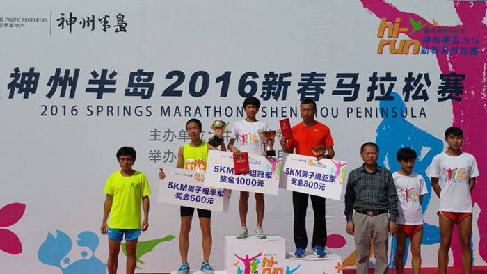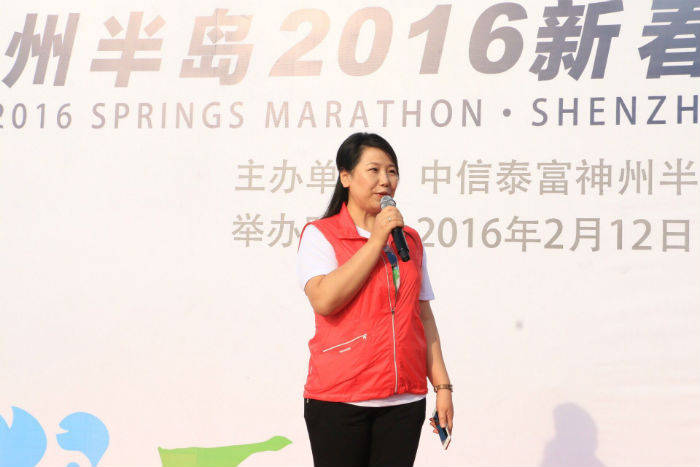 中信泰富地产品牌总监朱华越女士致辞。她表示,神州半岛2016新春马拉松秉承着积极的运动精神,倡导健康的生活理念,敢于拼搏、奋勇向前!今天参加比赛的有年过古稀的老人,也有刚刚成年的少年,希望各位朋友们在日后的生活中能更加积极的参与到马拉松这样一项开放且具有包容性的体育活动中来,在运动中领略自然的魅力,感受生命的激情,体会运动的快乐,强健自己的体魄,锻炼自己的意志!