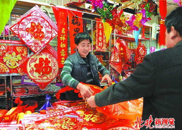 靳师傅在这里经营了十多年,平日里他卖婚庆用品,只有过年的时候才会卖福字、春联。因为要撤市了,他提前备好了这些年货。回想起在天意经营的这些年,靳师傅挺感慨的,从最初的红火、兴旺到受网店冲击后的惨淡,他和同伴们都一一经历过。说起未来,靳师傅想回老家找找机会,北京的小商品批发市场陆续外迁是趋势,“我们也要顺势而为,否则咋赚钱呢?”