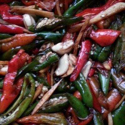将辣椒片、蒜片和姜丝一起放入腌汁中拌匀,冷藏保存,两三天后可食。