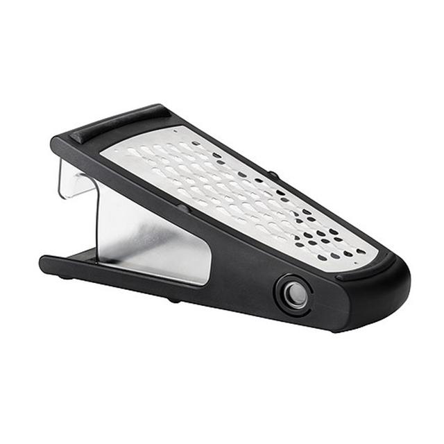 这款产品稍贵一些,设计上也更人性化一些。这款擦菜器横躺在厨房操作台上,使用面是斜的,比较顺手,菜品擦完就漏下,下面设计了一个盒子,方便收集和储存磨碎后的食材。总之,不容易削掉手上的肉啦。
