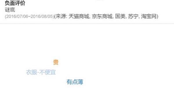 从两个品牌的总览表现来看,达衣岩在各个方面都要比谜底更加成熟一些。作为设计师品牌,本身的发展十分地艰难,所以谜底也常常需要借势于达衣岩。但是从用户反馈来看,达衣岩还是存在一些不足的。产品和尺寸被消费者不看好,虽然设计师品牌注重于特色,但是作为服装类的品牌依然逃脱不了质量这个大关,而且这两个品牌的服装材质以棉质类为主,需要在护理上小心一些,要提醒消费者一些洗涤的注意事项。衣服需要特色更需要满足消费者的需求,所以两个品牌都要完善自己的尺寸规格,让消费者更加满意。