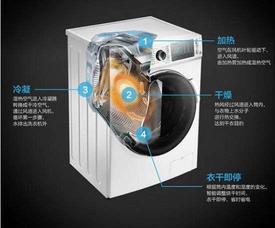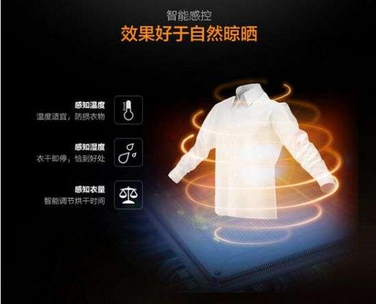 该机智能感控技术可自动感知温度,防止损坏衣物;对于湿度也可拿捏的恰到好处,衣干即停;对于洗衣量也由传感器自动感知,智能调节烘干时间,省时省心。