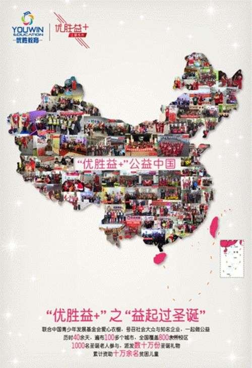 同年,优胜教育将公益事业正式命名为“优胜益+”,董事长陈昊亲自为项目定调,旨在打造联合社会各界力量关爱青少年的公益平台。优胜教育在2015年圣诞节,联合中国青少年发展基金会,携手社会知名企业,组织以“送温暖、送快乐”为主题的“益起过圣诞”暖冬公益行动。该活动历时40天,走过100多个城市,全国覆盖800余所校区,1000多名圣诞老人参与,派发数十万份圣诞礼品,资助十万余名贫困儿童!