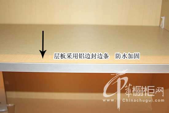 如图所示,层板采用的是铝边封边条,不但可以对板材的封边起加固作用,而且可有效防止物品外滑。在板式家具的生产中,封边是最重要也是使用最频繁的一道工序,就它的功能和结构而言,它不仅要起到边部的保护、防水、封闭有害气体的释放和减少变形等功能,而且更要起到美化和衬托家具的作用。做到美观,不仅要保证封边条与板的端面结合牢固平整,还要保证封边条与其它各面的结合处不能有露底、崩边、缝隙较大的缺陷,同时过渡还要自然、圆滑和流畅。