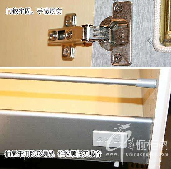 韩丽宅配的这款橱柜门铰手感厚实,表面光滑,质量不错。记者来回开关柜门几次,柜门开关顺畅,无掉肩和晃动现象。抽屉是采用隐形导轨,抽屉推拉顺畅,无太大噪音。抽屉可以完全打开和自动回吸,存取物较为方便。吊柜柜门采用液压支撑,柜门开闭顺畅,无噪音。