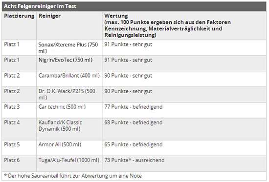 SONAX轮毂清洁剂不负众望成为该权威测试的优胜者,并被德国机动车监督协会推荐为轮毂清洁首选产品。其它几款清洁剂都或多或少的存在各种扣分点。尤其在被列为“不被推荐”的TugaAluminium-Teufel,不仅清洁性能劣质,酸性超强,还在存在严重腐蚀性的成分,无一能像SONAX轮毂清洁剂做到各方面完美无暇!